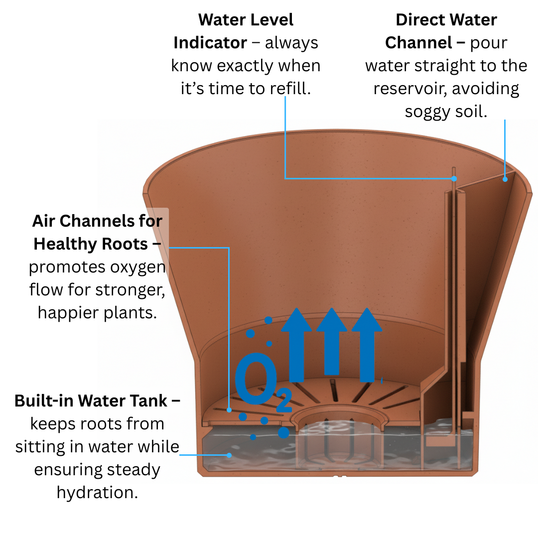 - Built-in Water Tank – keeps roots from sitting in water while ensuring steady hydration.